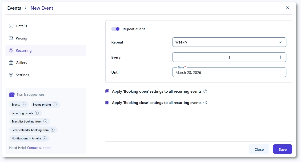 A good example is a weekly lecture. If a lecture takes place every Monday from 10:00 to 14:00 and contains the same content each week, attendees typically book only one occurrence, not the entire series. Because of this, bookings do not carry over to future occurrences. Booking one recurring event never adds the attendee to all other events in the series.